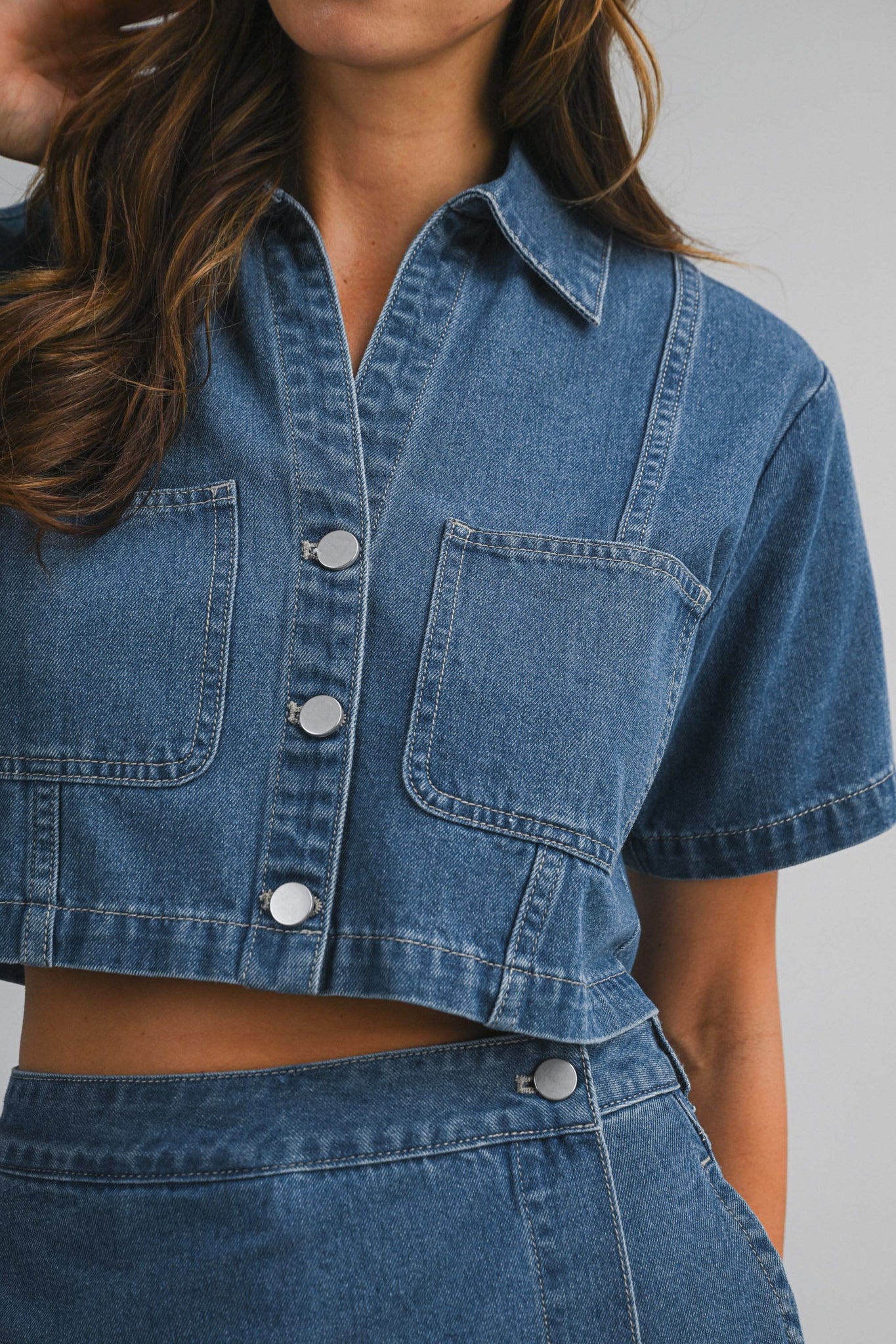 Effortlessly chic two-piece set featuring a denim short sleeve collar shirt with button-down front and a coordinating skort with distinctive side button closure. This set offers a polished look perfect for casual outings or weekend adventures. The cropped shirt pairs seamlessly with the skort for a cohesive, put-together style that transitions beautifully from day to night.