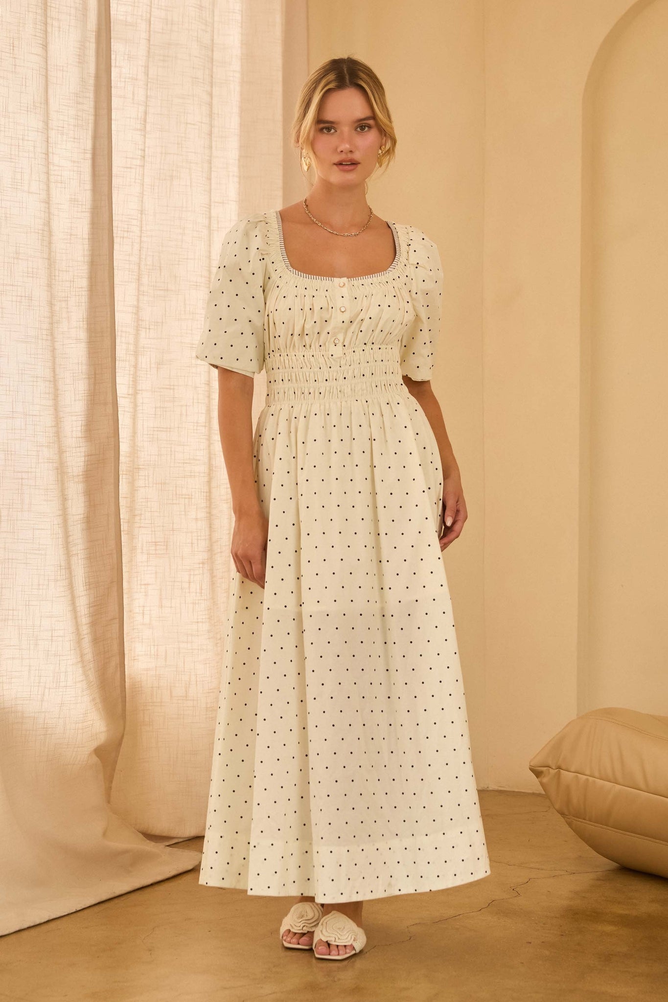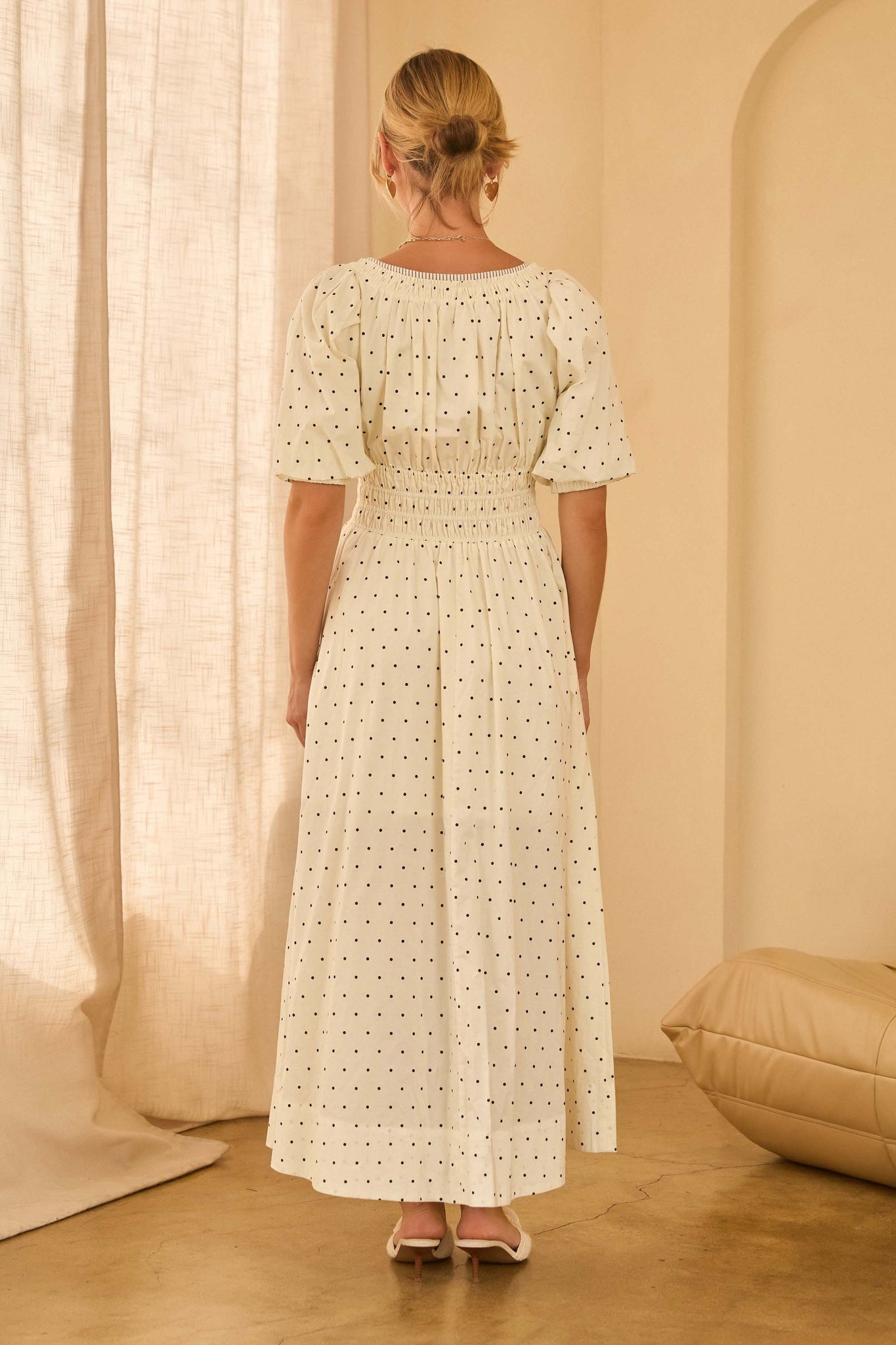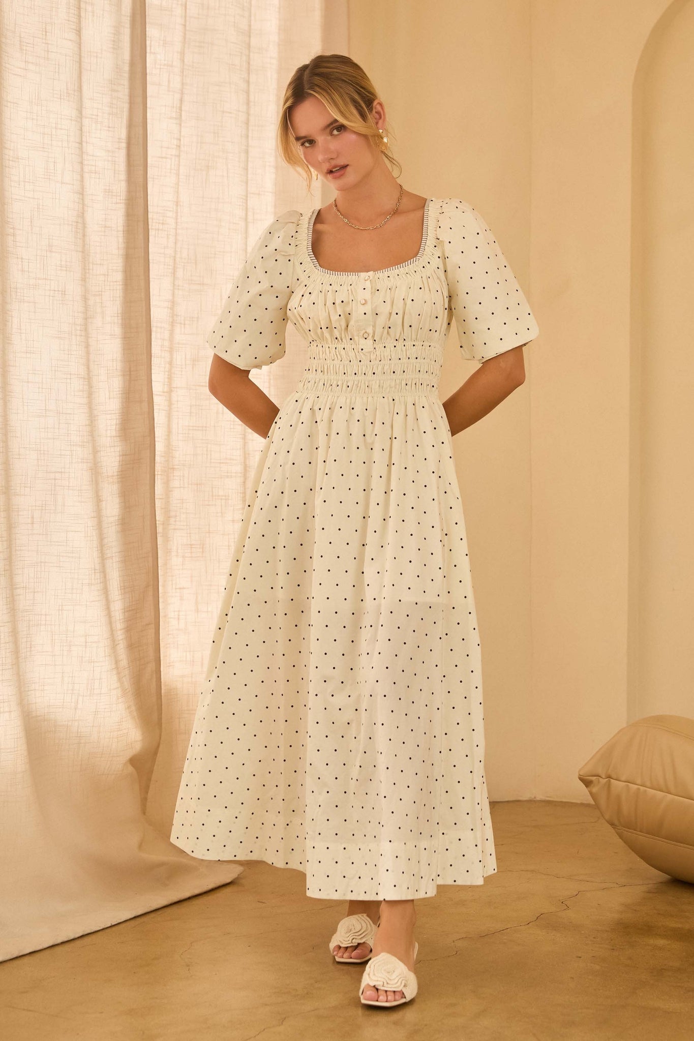 Short Puff Sleeve Polka Dot Poplin Midi Dress Timeless elegance meets playful charm in this midi dress, designed with delicate puff sleeves and an allover polka dot print. The crisp poplin fabric provides structure while remaining breathable and comfortable for all-day wear. Its thoughtfully proportioned silhouette flatters various body types, while the midi length offers versatility—dress it down with casual sandals or elevate it with heels for evening events. A wardrobe essential that transitions seamlessly from weekend outings to more refined occasions.